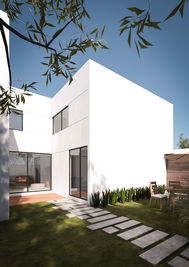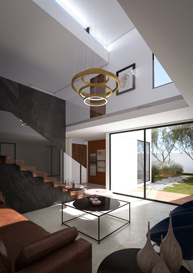Aunado a este requerimiento, la privacidad y seguridad fueron una preocupación principal para los dueños. Por tal motivo, en Croma Arquitectura, propusimos al frente volúmenes puros, conectados a lo largo de ambos predios y con el mínimo de aberturas; sin embargo, al interior, el esquema arquitectónico planteado incluye un gran jardín central que conecta los espacios de los dos terrenos, permite el flujo adecuado y otorga la sensación de amplitud.